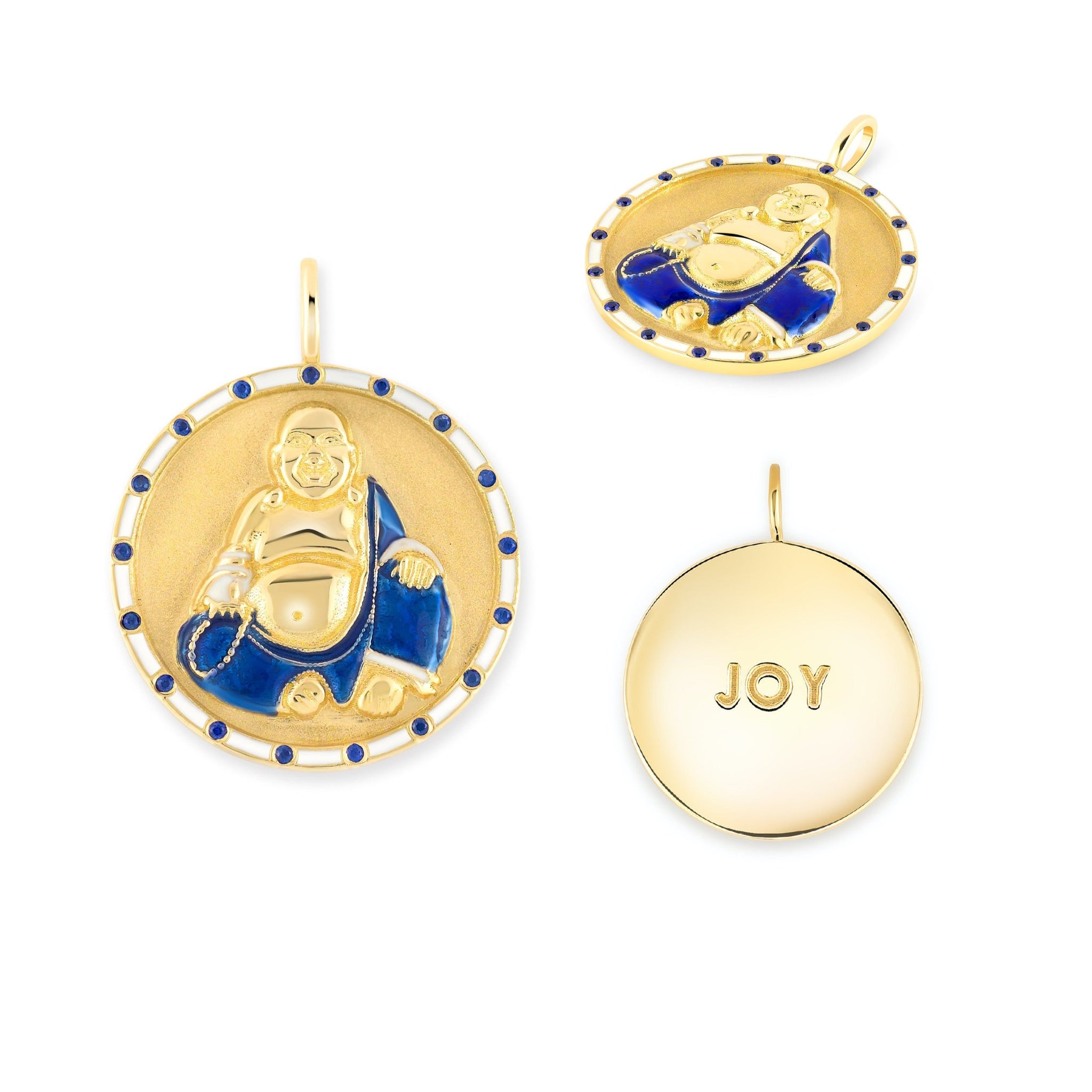 Our gold, diamond, and pink enamel Joy Buddha Pendant reminds us of the happiness to be found in life. The vibrant pink and orange enamel bring pops of playful color, and the sparkling diamonds provide a hint of twinkle to your everyday neck stack. The back of the gold disc is debossed with the word "JOY." Made to order, please allow 7-10 business days for shipment.