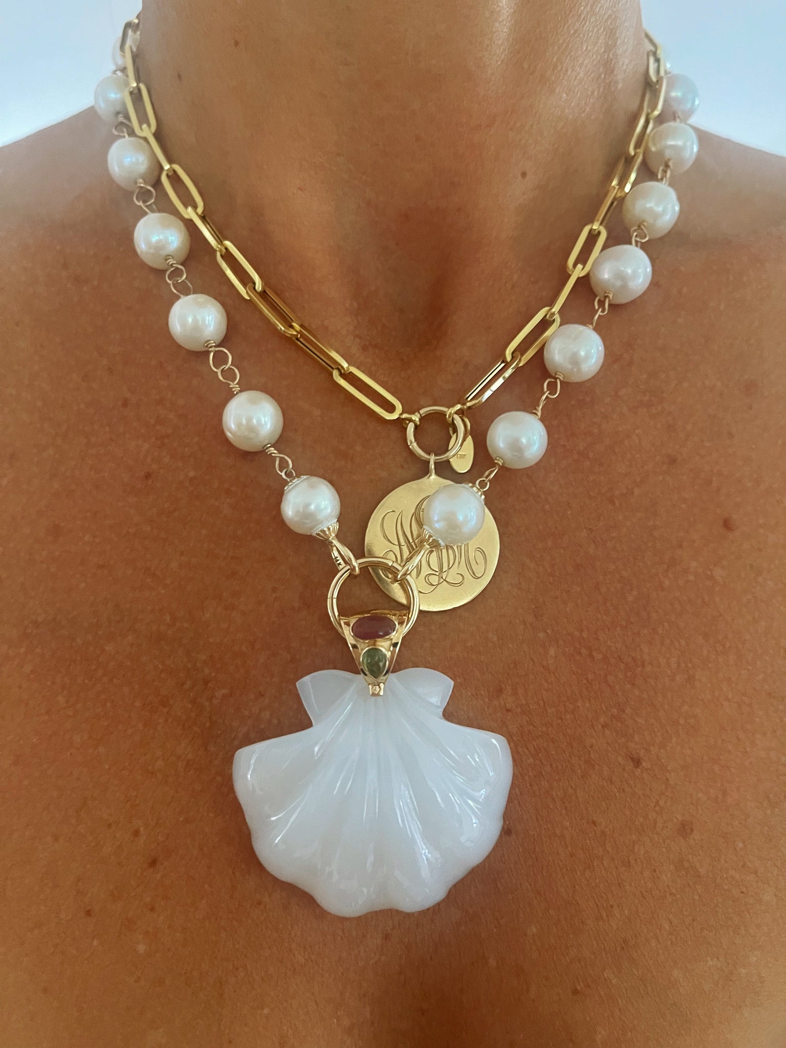 Our White Onyx XL Scallop Shell Pendant is a striking statement piece, showcasing a unique, ethereal glow. White onyx is a translucent gemstone with a predominantly white or creamy color, often featuring soft, parallel bands or veins of gray, beige. Finished with a 14K gold bail adorned with vibrant tourmaline stones, this pendant balances boldness and elegance. Beautiful layered with our String of Pearls or leather cord necklace for a refined yet effortless look.
