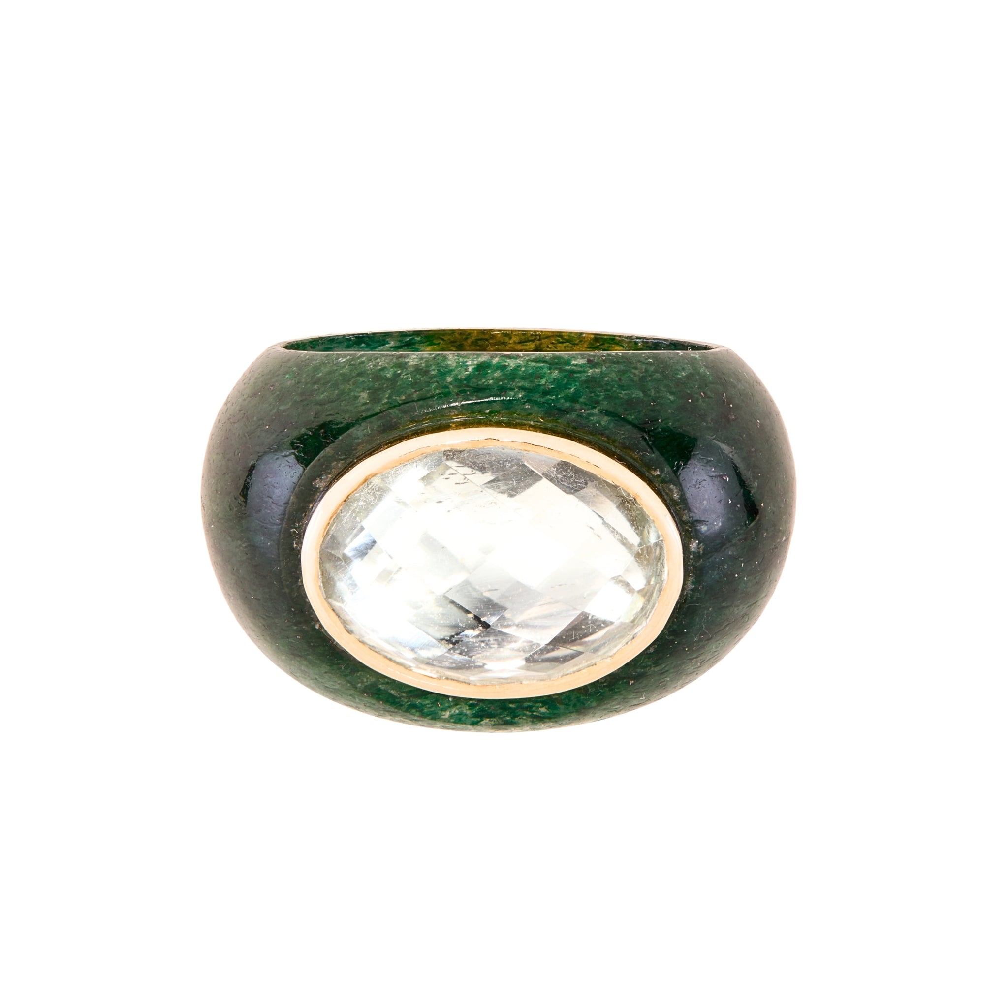 A statement of modern elegance, this sculptural Green Aventurine ring features a rose-cut green amethyst at its center. The combination is grounded yet luminous. Green aventurine is known as the “stone of opportunity,” said to attract prosperity, luck, and confidence. Its soft, mossy shimmer feels grounding and vibrant, perfect for new beginnings and bold intentions. Size 5-8. Custom sizes available upon request.