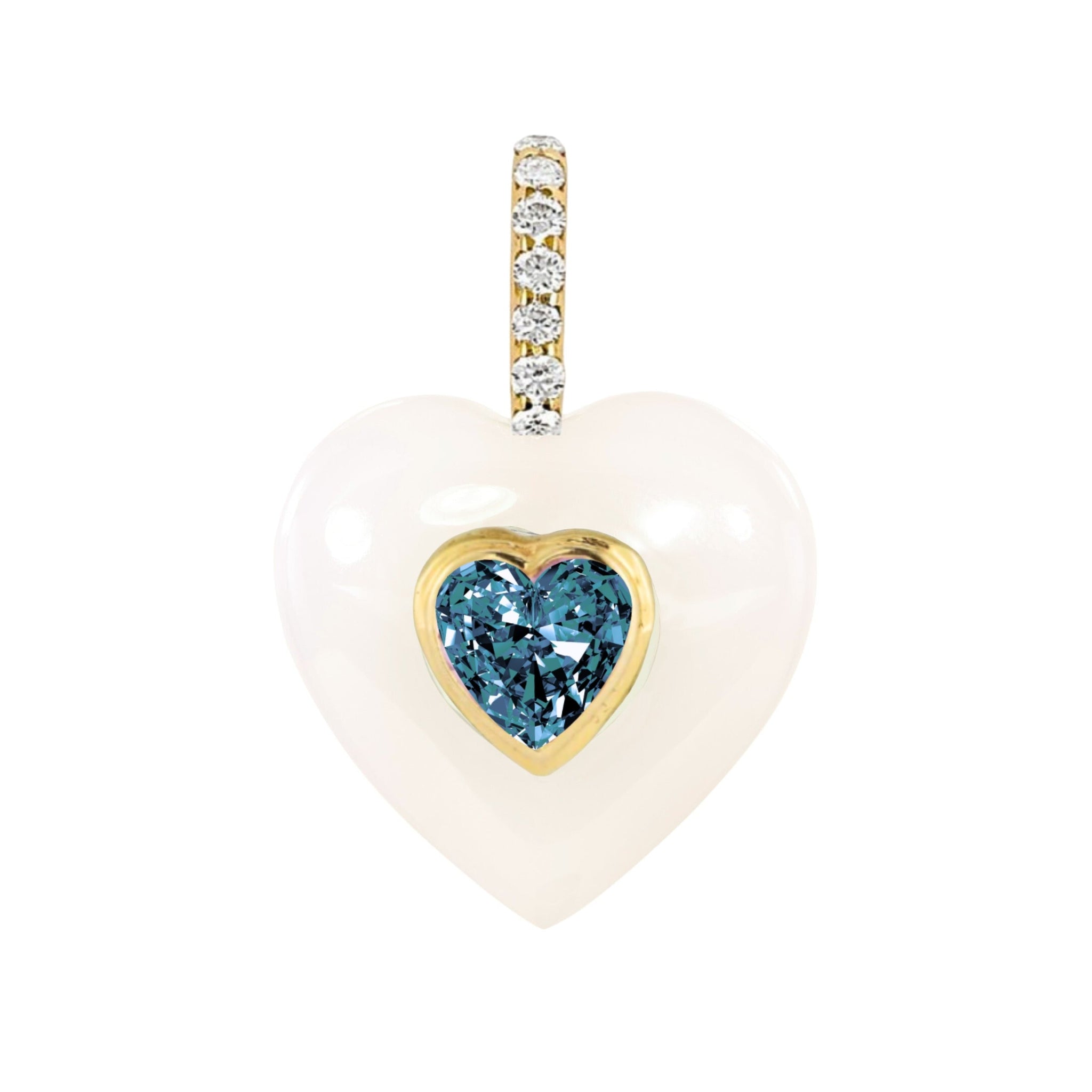 Dimensional gemstone heart pendant carved from genuine White Onyx gemstone with a single Blue Topaz center stone and diamond bail. Made to order, ships in 7-10 business days.