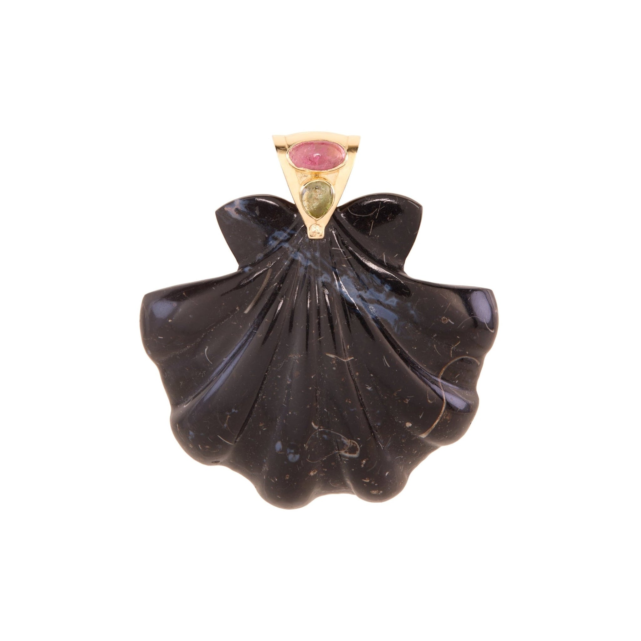 Our XL Scallop Shell Pendant is a striking statement piece, showcasing the natural depth and character of Black Calcite Rock. Finished with a 14K gold bail adorned with vibrant tourmaline stones, this pendant balances boldness and elegance. Beautiful layered with our beaded necklaces or leather cord for a refined yet effortless look.