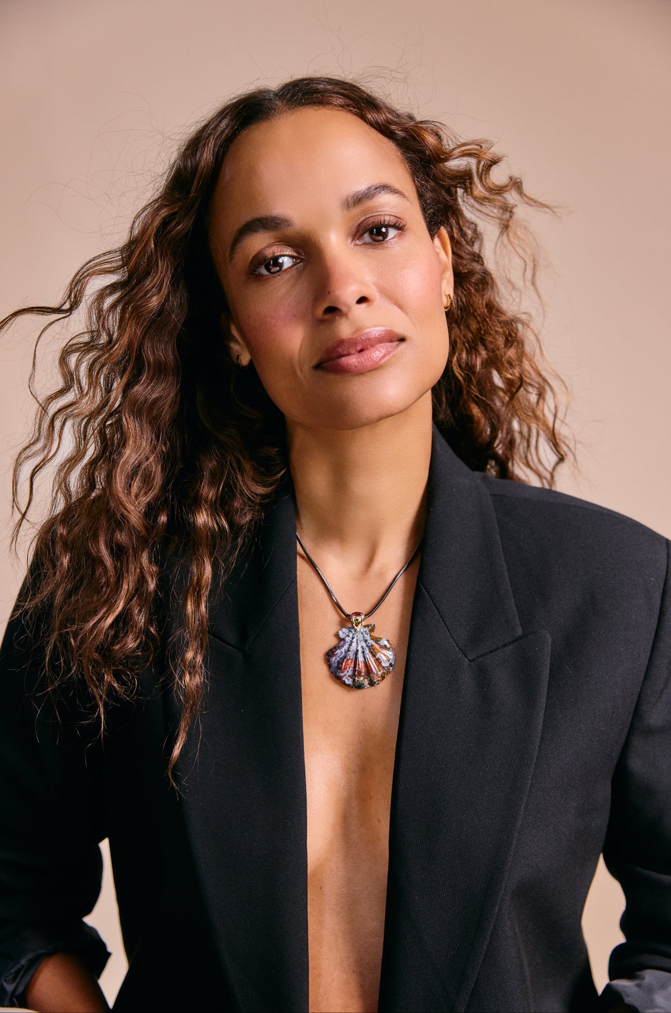 Our Black Calcite, Extra Large Scallop Shell Pendant is a striking statement piece, showcasing the natural depth and character of Black Calcite Rock. Finished with a 14K gold bail adorned with vibrant tourmaline stones, this pendant balances boldness and elegance. Beautiful layered with our beaded necklaces or leather cord for a refined yet effortless look.